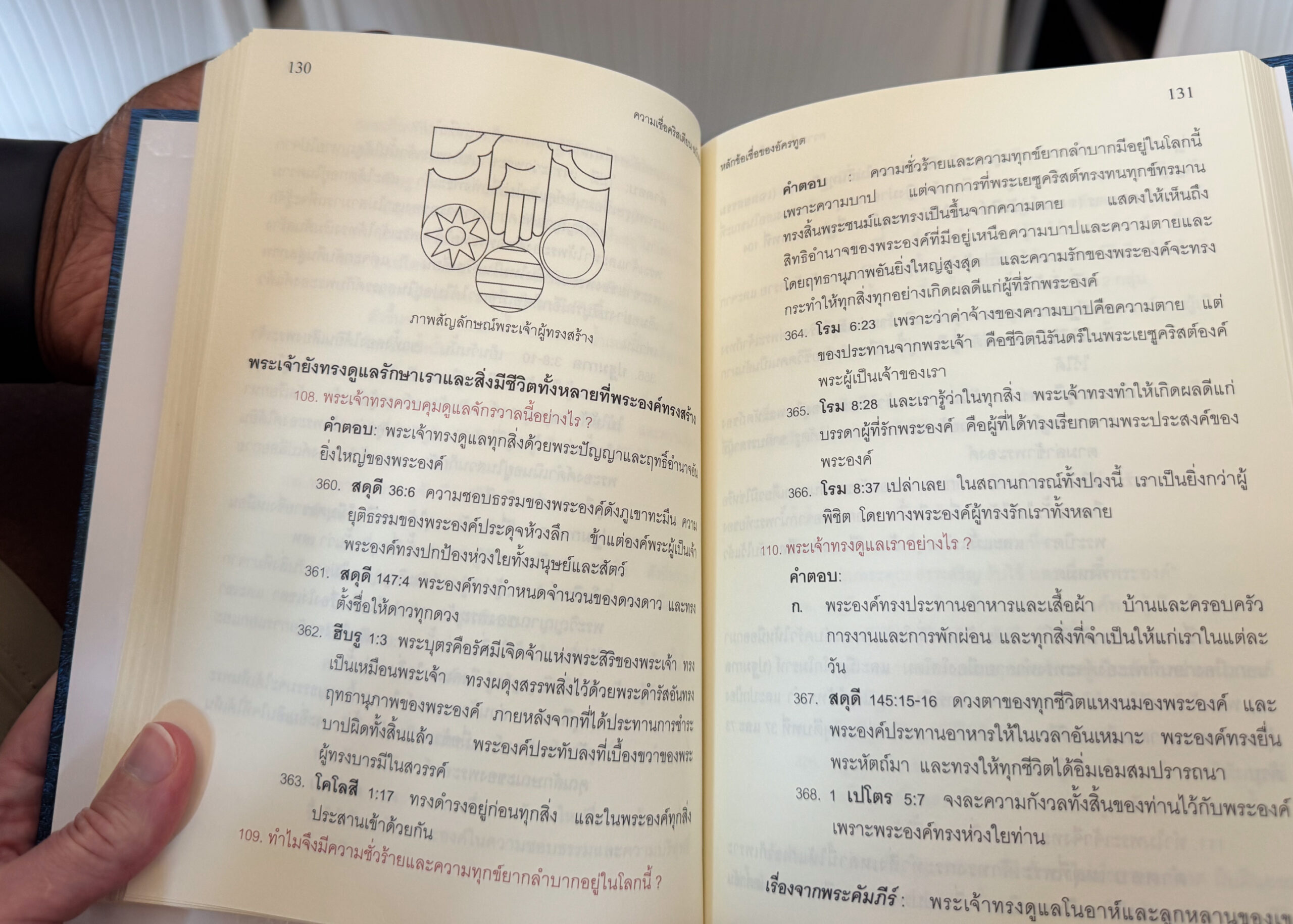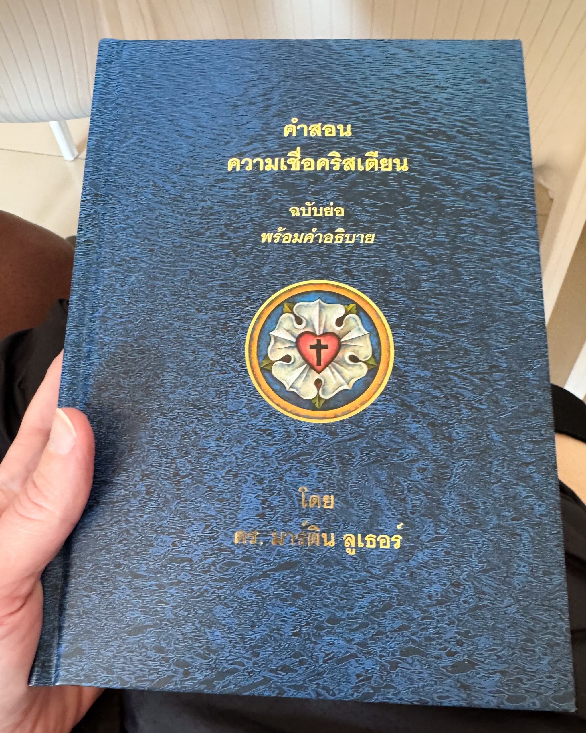 Promise Lutheran Church decorated with Advent candles and a small Christmas tree, and Luther's Small Catechism in Thai.